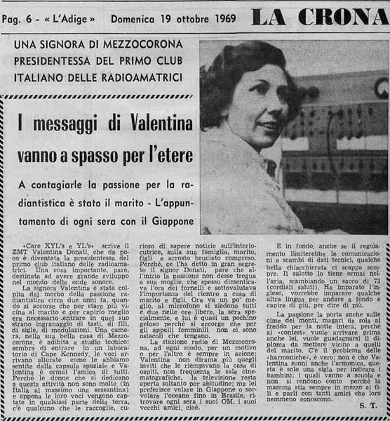 Nel 1969, Valentina Donati, Presidentessa del primo Radio Club Italiano delle Radioamatrici, da Mezzocorona capta una richiesta dal Venezuela per la ricerca di un farmaco e si rivolge per un aiuto al giornale l’Adige che tramite proprie conoscenze coinvolgerà i medici locali.